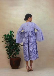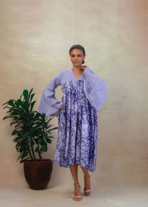 Collarless shirt dress made with striped cotton and adire fabric.